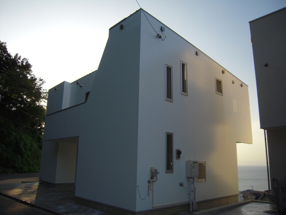 海が一望出来る丘の上に立つリゾートハウス。象徴的な場所であり白いオブジェとして建築したかった。住宅の中心を抜き貫通した景色を建築の一部として取入れ、且つ道路を歩く人達にも閉鎖的ではなく景観を共有させたかった。一連の白い家の町並みの一部として形成させている…。